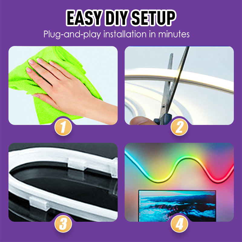 CONCEPTION FLEXIBLE, INSTALLATION FACILE – Pliez-la. Tordez-la. Modelez-la à votre guise. Cette bande ultra-flexible s'installe en quelques minutes et s'adapte facilement à toutes les surfaces et tous les contours. Encadrez votre moniteur, tracez vos murs ou illuminez votre bureau : c'est la créativité plug-and-play pour votre style unique.