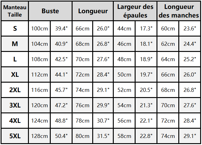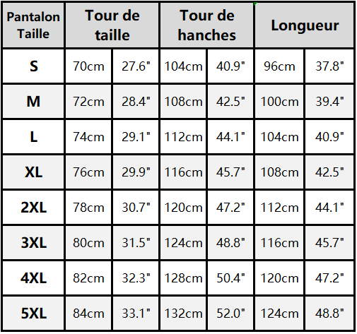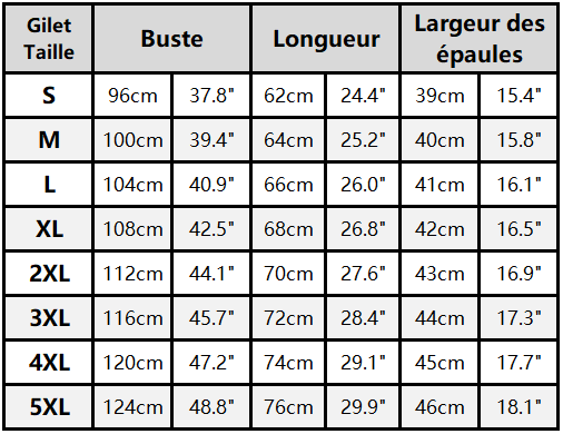 Tableau des tailles détaillé