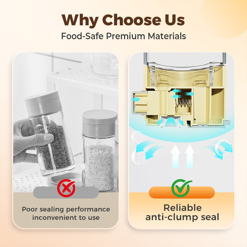 CONFINEMENT DE L'HUMIDITÉ, CONSERVATION DE LA FRAÎCHEUR: Notre joint de protection bloque efficacement l'humidité et les huiles de cuisine. Les épices restent parfaitement sèches et fluides, sans jamais durcir en un bloc frustrant. Profitez du plaisir d'avoir des ingrédients toujours prêts à l'emploi à portée de main.